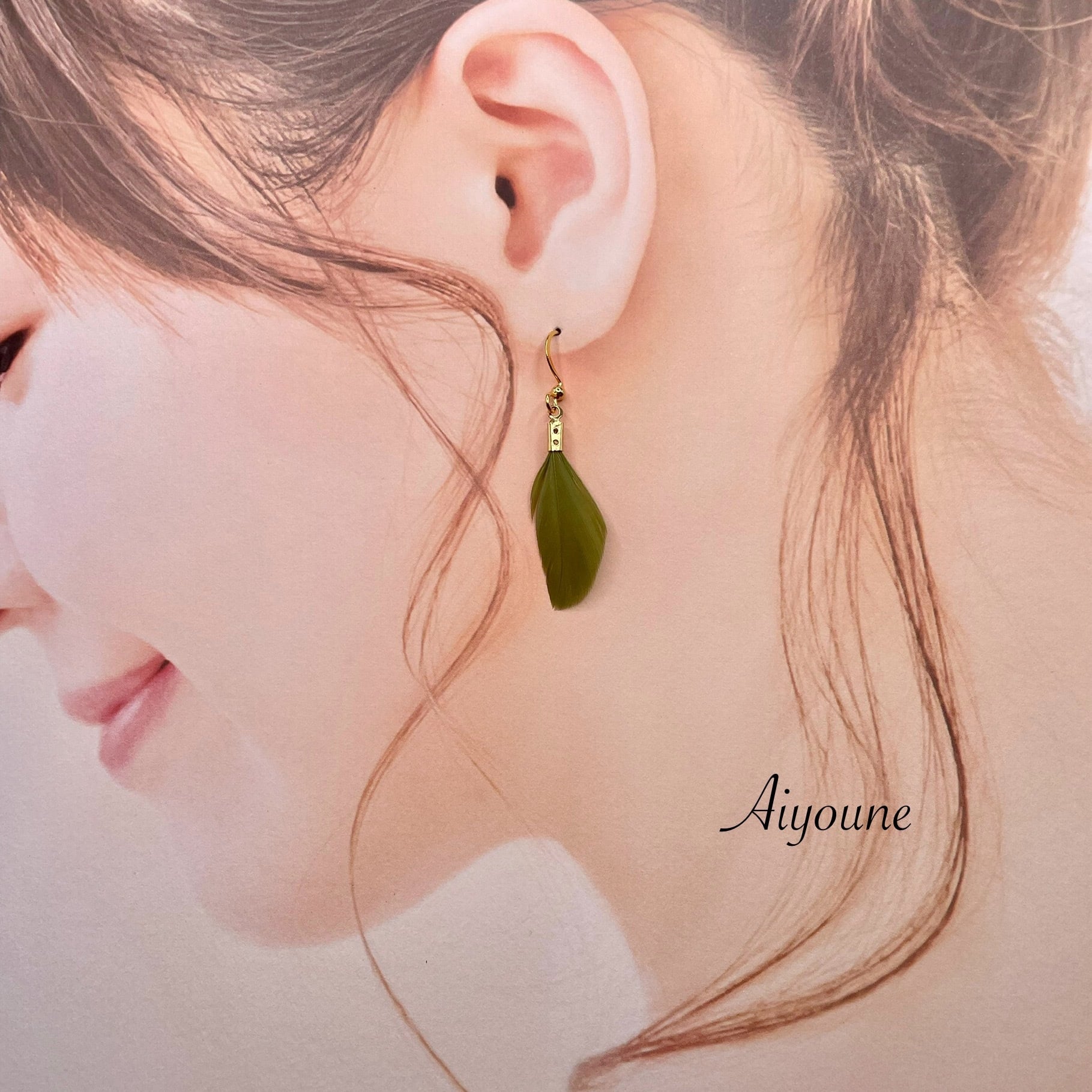 フェザーは本物の鳥の羽を使用し、フェザーの金具は真鍮製です。濃いめのグリーンが落ち着きあり、かっこよく演出してくれます。